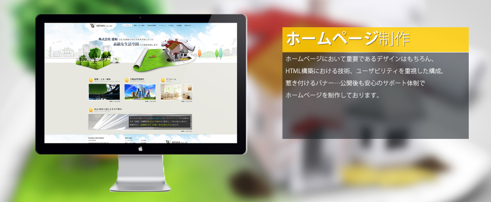 ホームページにおいて重要であるデザインはもちろん、HTML構築における技術、ユーザビリティを重視した構成、惹き付けるバナー…公開後も安心のサポート体制でホームページを制作しております。 -